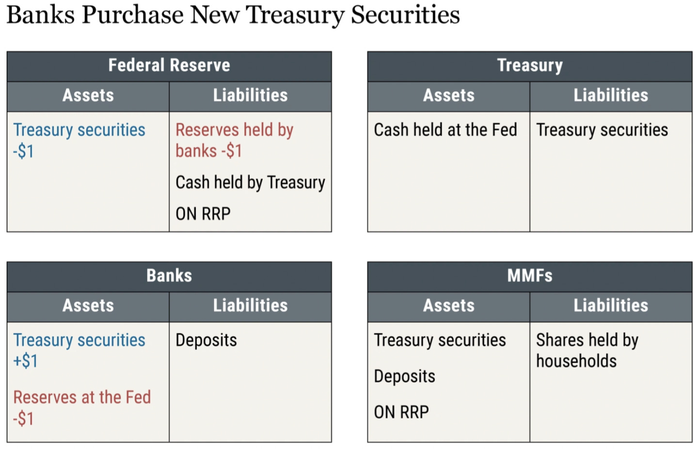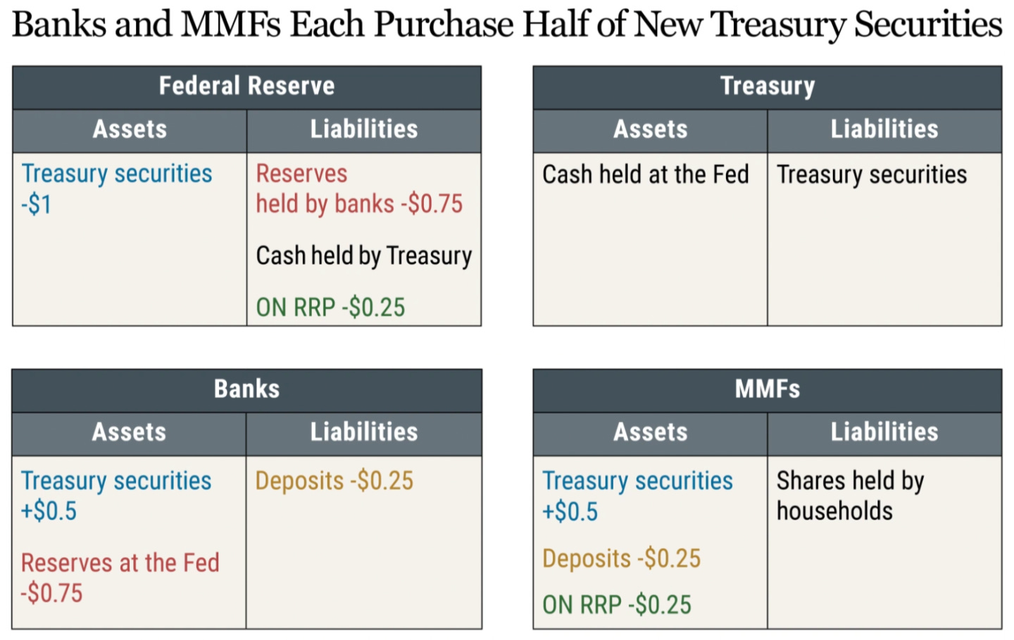 下图展示了当银行和 MMF 各自购买一半新发行的国债时会发生什么。 具体过程留给读者做练习。