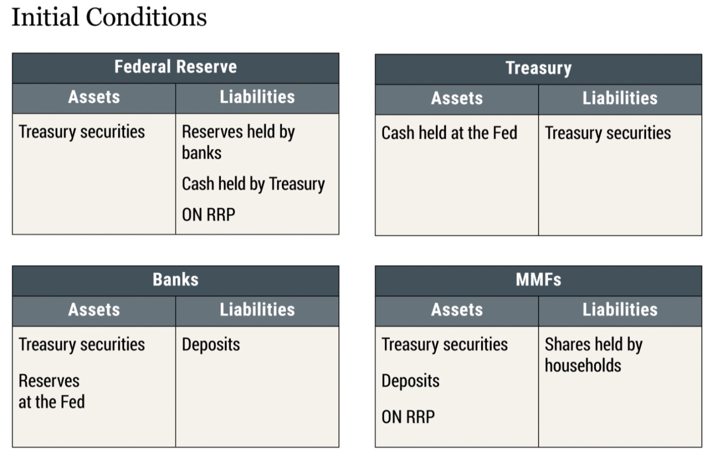 在下面的图表中,我们描述了美联储、财政部、银行和货币市场基金 (MMF) 的简化资产负债表。我们只展示了对理解美联储行动至关重要的资产负债表项目。