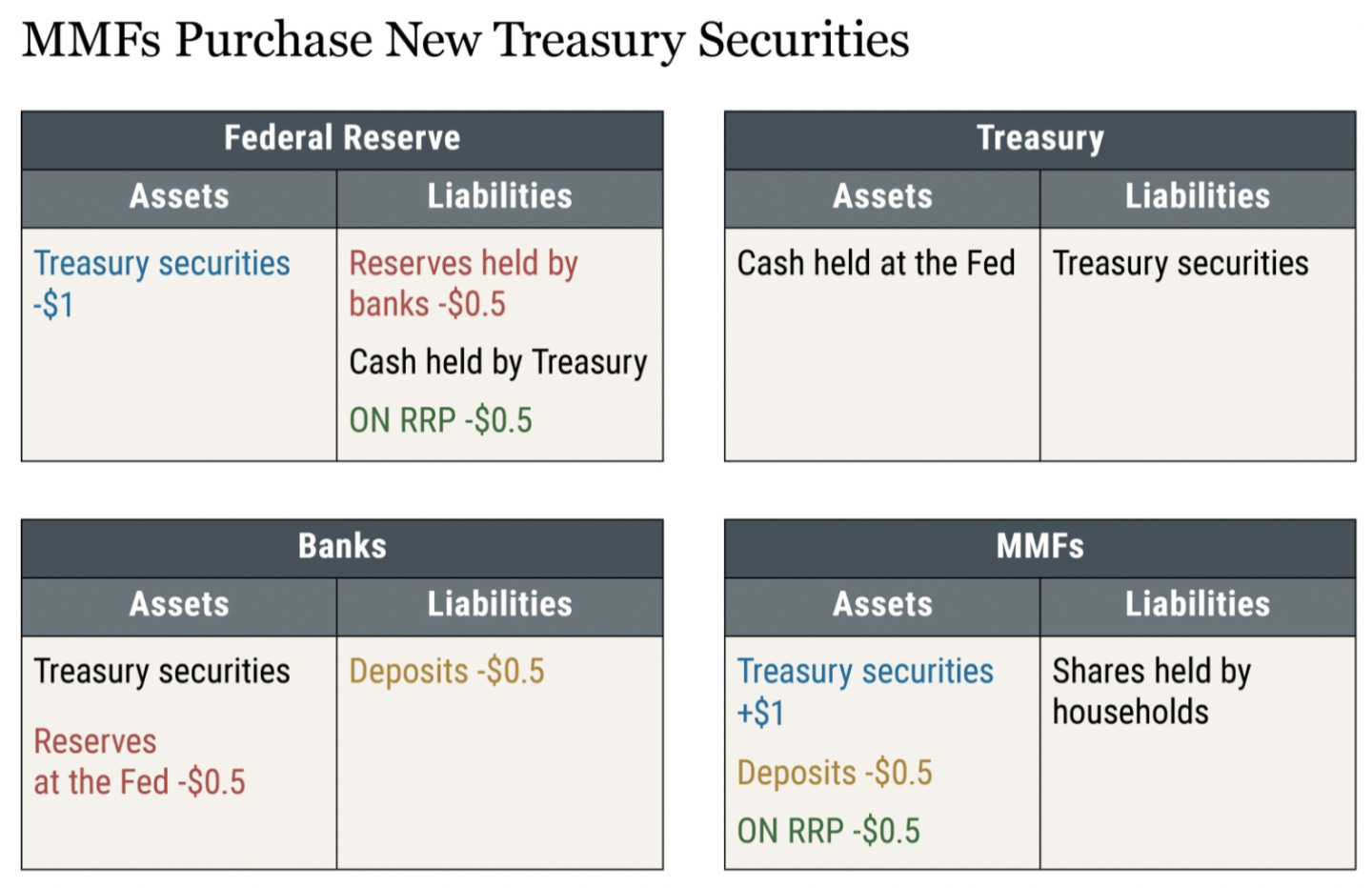 在银行的资产负债表上,资产方面包括美国国债和美联储持有的准备金;在负债方面,包含居民与MMF持有的存款。对于MMF来说,其存款包含用于交易资产的存款,以及在市场上购买的隔夜和定期投资型存款。
